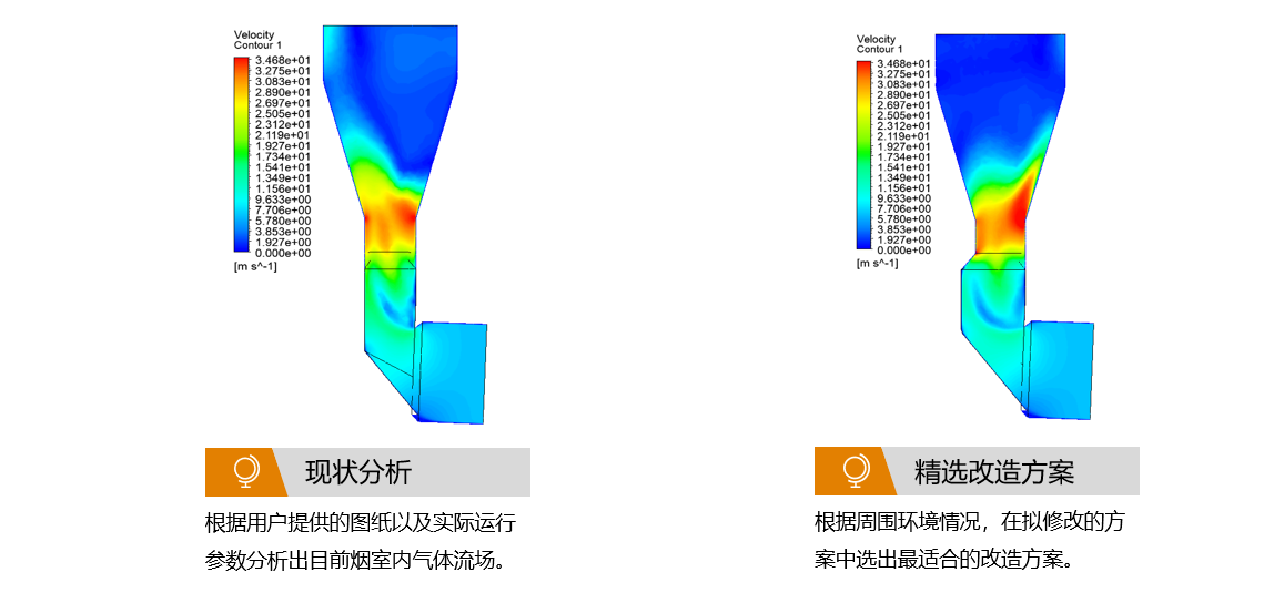 CFD 相当于“虚拟”地在计算机做实验,模拟仿真实际的流体流动情况、燃料燃烧情况、物料输送情况、混合情况等等。我们会根据现场收集、测量的数据、图纸和现场参数建立1:1模型,进行CFD模拟,整理仿真结果,出具仿真报告;分别对不同的改造方案进行模拟分析,选出效果更好,成本更低的一个。