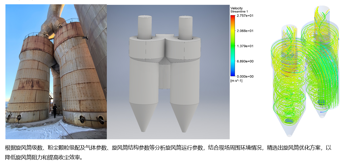 根据旋风筒级数,粉尘颗粒级配及气体参数、旋风筒结构参数等分析旋风筒运行参数。结合现场周围环境情况,精选出旋风筒优化方案,以降低旋风筒阻力和提高收尘效率。