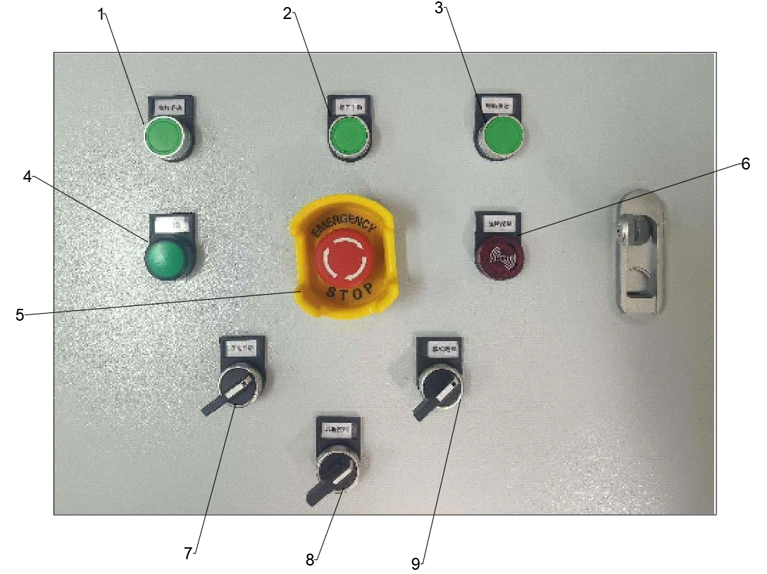 如下图2所示,电气柜表面有三个按钮开关,一个急停开关,两个指示灯,三个切换开关;其中1为在手动模式下按动按钮控制推杆动作,2为手动模式下按动按钮控制推刀动作,3为手动模式下按动按钮控制转动动作;4为本地控制指示灯,若该灯亮则表示系统处于本地控制模式,远控不能进行操作;5为急停按钮,若发生故障可按下此按钮,设备立即停止供电;6为鼓掌报警灯,若出现一些故障时该按钮会亮起并发出警报声;7为手动与自动切换开关,拨动此开关系统会在手动模式与自动模式间切换,8为远程控制切换开关,拨动此开关可在远程控制与本地控制两种模式间切换,9为自动模式下的工作模式选择,拨动此开关可在定时模式与感应模式间切换;以上按钮存在优先级,1,2,3,4这四个按钮优先级最低,必须要系统处在手动模式或者自动模式下才可用,优先级最高的是5号急停按钮,按下直接断电,其次是8号远程控制切换开关,不管系统处于手动还是自动,以及什么工作模式都会直接切换,再次之是手动自动切换开关,必须系统处在本地控制模式下才会生效。
