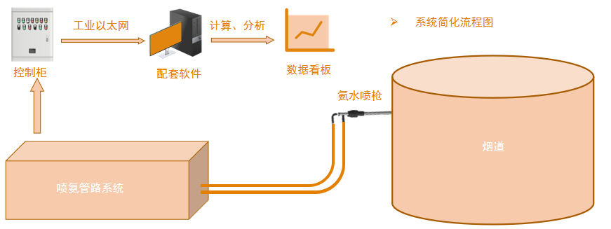 管路系统负责泵送,分配,调节氨水,上位软件实现数据滤波收集、算法计算、结果输出并输出控制指令。控制单元负责现场控制、接收指令等,氨水喷枪则将氨水雾化喷入烟道。