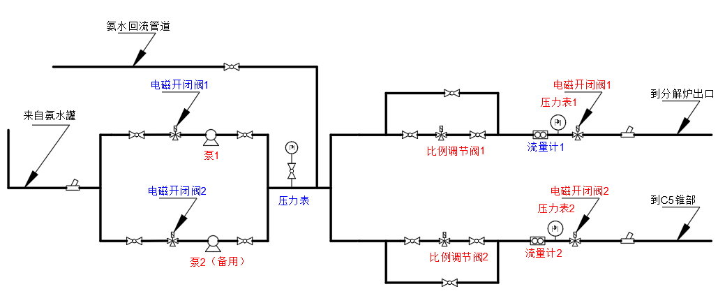 通用喷氨管路系统工艺图如下,主要是管路阀门控制氨水基本流向,双泵一用一备,传感器检测管路状况,比例阀调节管路流量大小与流量分配。